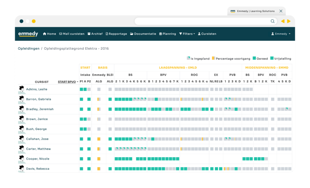 Met Emmedy LMS werk je efficiënt, doordat het de mogelijkheid biedt om trainingen in te plannen, toetsen aan te bieden, docenten gemakkelijk in te plannen, de trainingen zelf samen te stellen en in één overzicht de voortgang van cursisten te bekijken in het leerlingvolgsysteem. Win tijd én geld door afscheid te nemen van de verschillende Excel-documenten, de onoverzichtelijkheid en de tekortkoming aan mogelijkheden als het gaat om het aanbieden van trainingen.